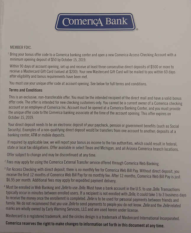 - Comerica Bank is offering a $200 Mastercard Gift Card bonus for opening a new Comerica Access Checking Account