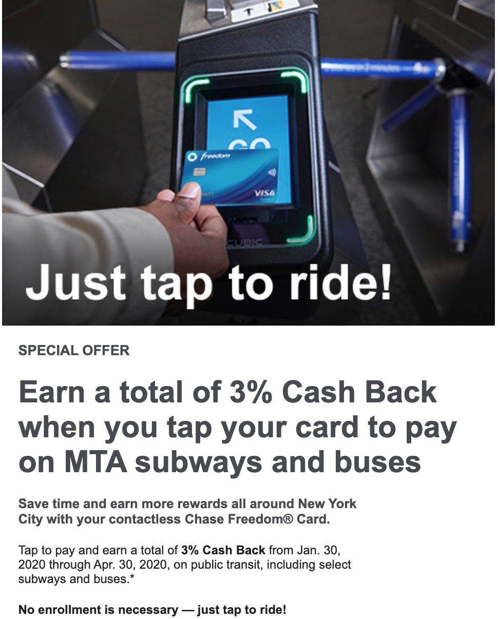 - Tap to pay and earn an extra 2% Cash Back from Jan. 30, 2020 through Apr. 30, 2020, on public transit, including select subways and buses.