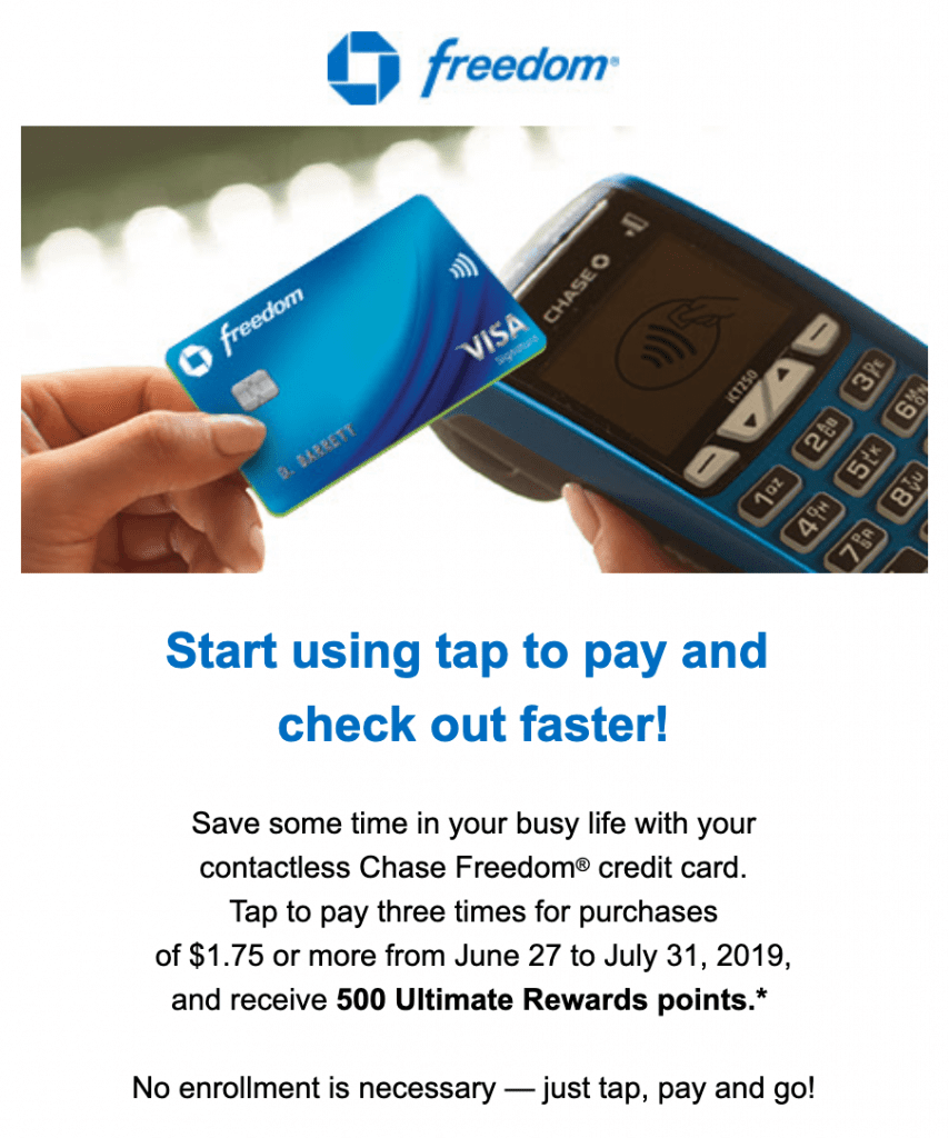 - Get an additional 500 bonus points for making three contactless purchases from 06/27/2019 through 07/31/2019 using your card during checkout.