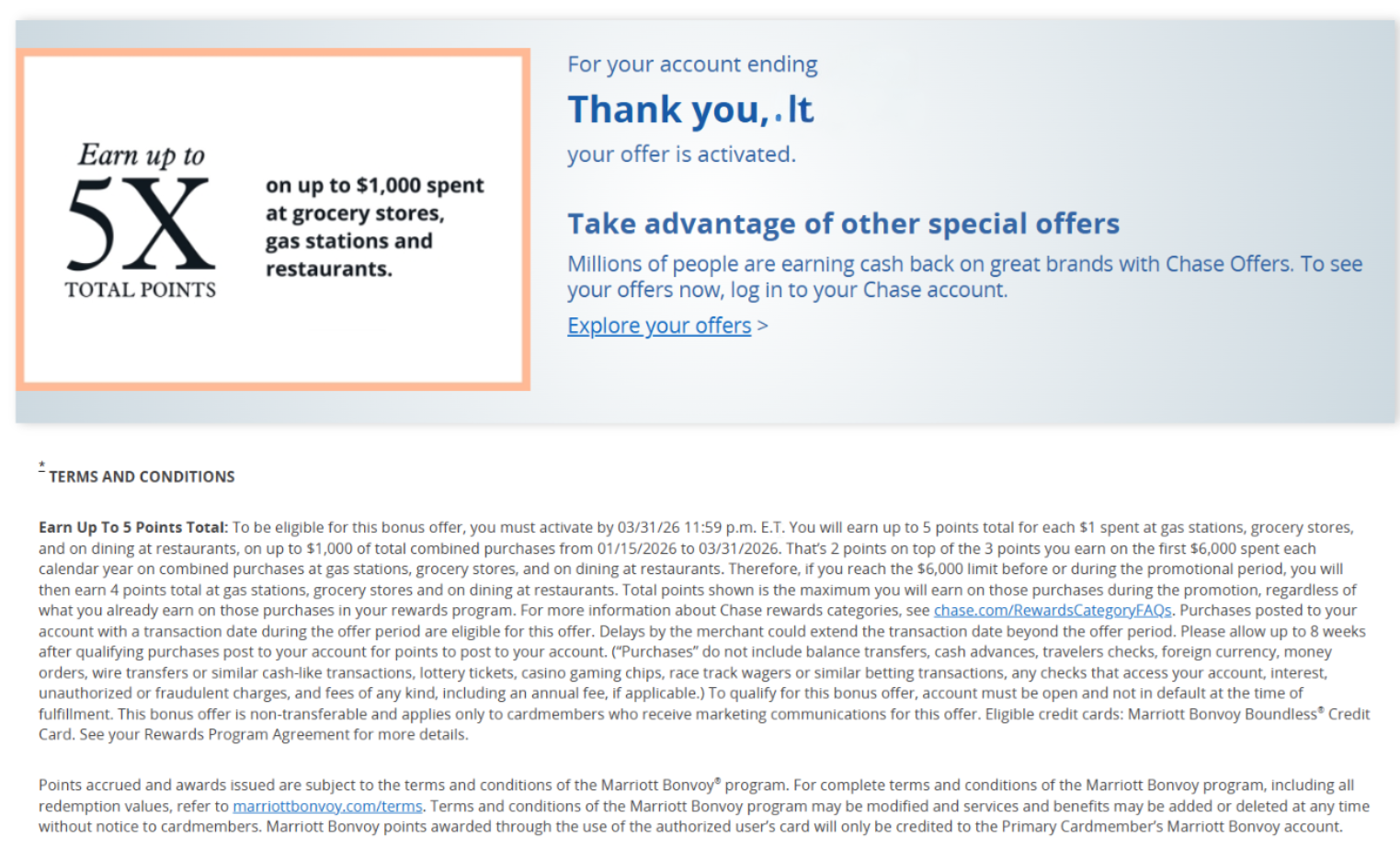 - Activate and get 5x points or 5% cashback on up to $1,000 in spend at Grocery Stores, Gas Stations, and Restaurants. Valid through 3/31/26.