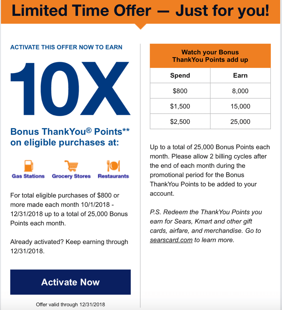- Citi has sent out some lucrative spending offers to Citi Sears cardholders. Here are some of the offers seen: