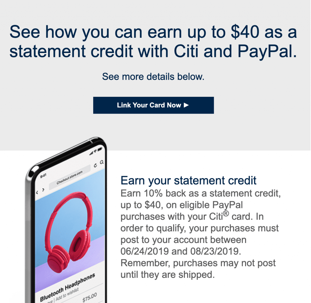 - Earn 10% back as a statement credit, up to $40, on eligible PayPal purchases with your Citi card between 06/24/2019 and 08/23/2019.