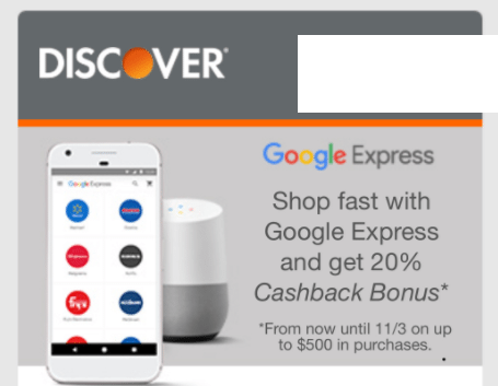 - Some Discover cardholders are being offered 10-20% cash back on up to $500-$1,000 in purchases when you use your Discover card at Google Express.