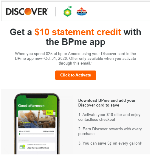 - Offer valid 8/31/2020–10/31/2020. Earn a $10 statement credit when you activate this offer in this email and then make purchase(s) of $25 or more on the BPme app with your Discover card. Limited to one $10 statement credit on the Discover account listed above. The $10 statement credit will be applied within two statement periods. Offer is non-transferable.
