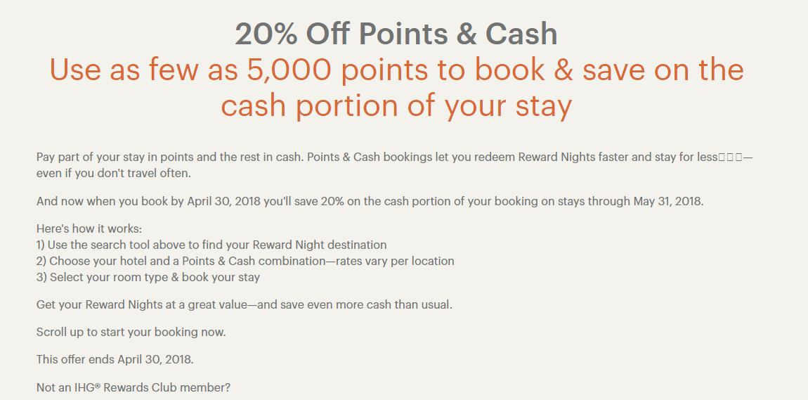 - Save 20% when you make a points & cash booking with IHG. Book by April 30th for stays from now until May 31st, 2018. The discount will only apply to the cash portion of the rate