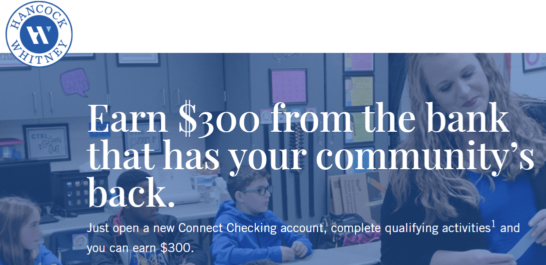 - Hancock Whitney Bank is offering a bonus of $300 when you open a Connect Checking account and complete the following requirements: