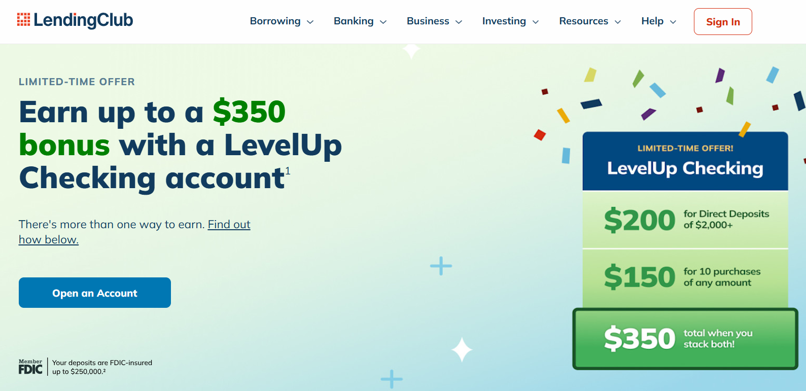 - LendingClub is offering a bonus of up to $350 when you open a new LevelUp checking account: