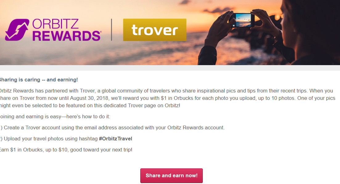 - Offer is valid for each photo, up to ten (10) photos, that are shared on Trover.com using #OrbitzTravel from 12:01AM CT, Saturday, July 21, 2018 through 11:59PM CT, Friday, August 31, 2018.