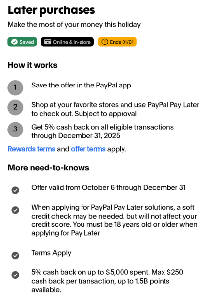 - PayPal is offering some account holders 5% cashback when you pay in 4 (limit of $5,000 in spend or $250 cashback). Valid until 12/31/25