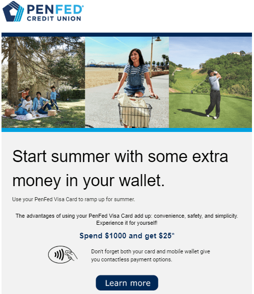 - In order to receive the $25 credit to your statement, you must spend at least $1000 or more during the promotion period using your PenFed Visa Card ending in xxx.