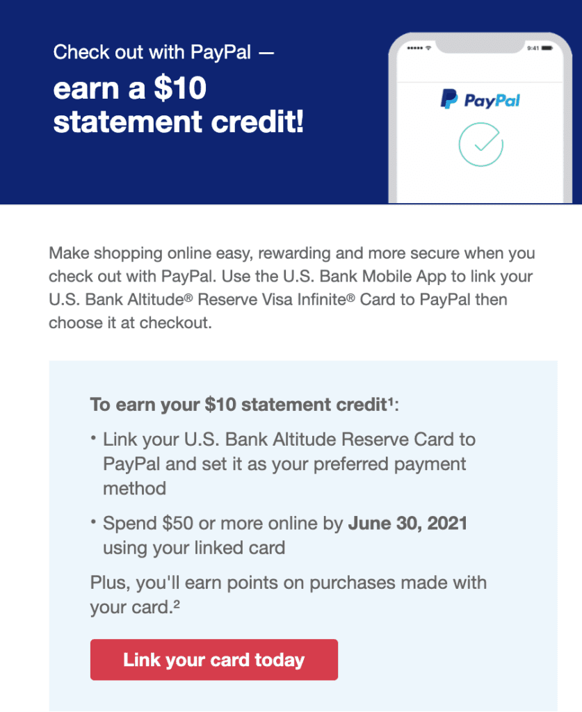 - U.S. Bank is offering some cardholders a $10 statement credit when you check out with PayPal and spend $50+