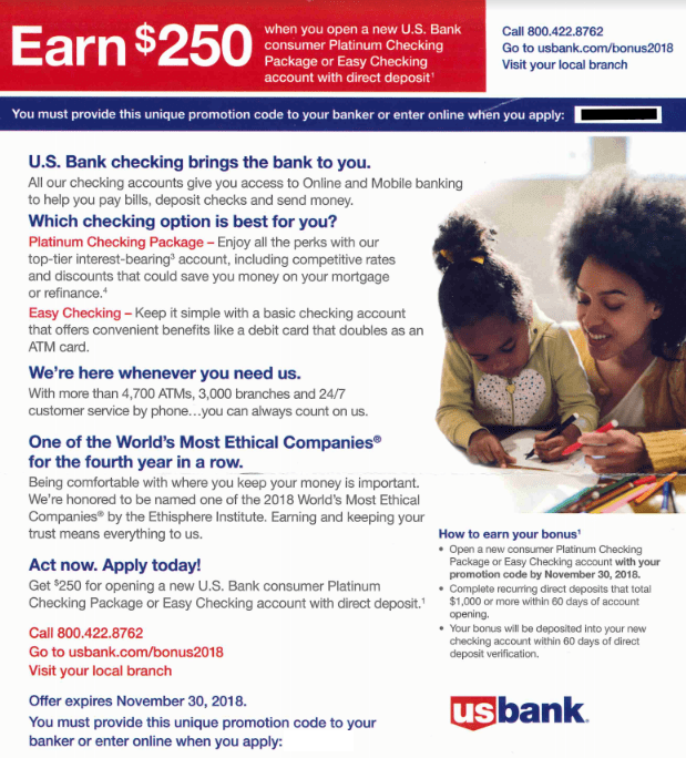 - Receive a bonus of $250 when you open a new U.S. Bank Platinum Checking Package or Easy Checking account when you complete the following requirements: