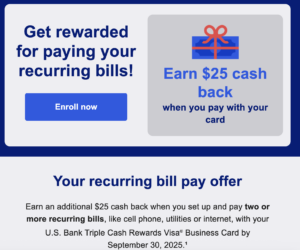 - This offer runs July 1 – September 30, 2025 (promotion period), and you need to enroll by July 31, 2025. To be eligible for the offer, you must set up and pay two recurring bills with the same qualifying provider twice or two different qualifying providers by September 30, 2025. If you qualify, the $25 cash back award will be applied to your account 2-3 billing cycles after the end of the promotion period. The maximum number of cash back awards is one. This offer is not transferable. Your account must remain open and be in good standing (not past due or overlimit) to qualify. This offer may not apply if your credit card has changed to a different type of card within the last 12 weeks or changes before the cash back award is applied. U.S. Bank cannot control how merchants choose to identify their business and/or classify purchases and reserves the right to determine which purchases qualify. Contact your billers to learn what types of payments they accept; not all billers accept credit card payments. If you have any questions, call Cardmember Service at 866-485-4545.