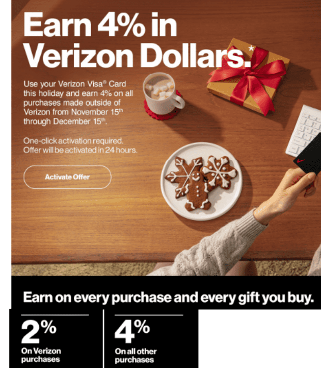 - Verizon Credit Card is offering 4% in Verizon dollars on all purchases from 11/15 – 12/15