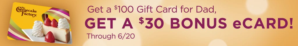 - The Cheesecake Factory is offering a $30 bonus eCard when you purchase a $100 gift card
