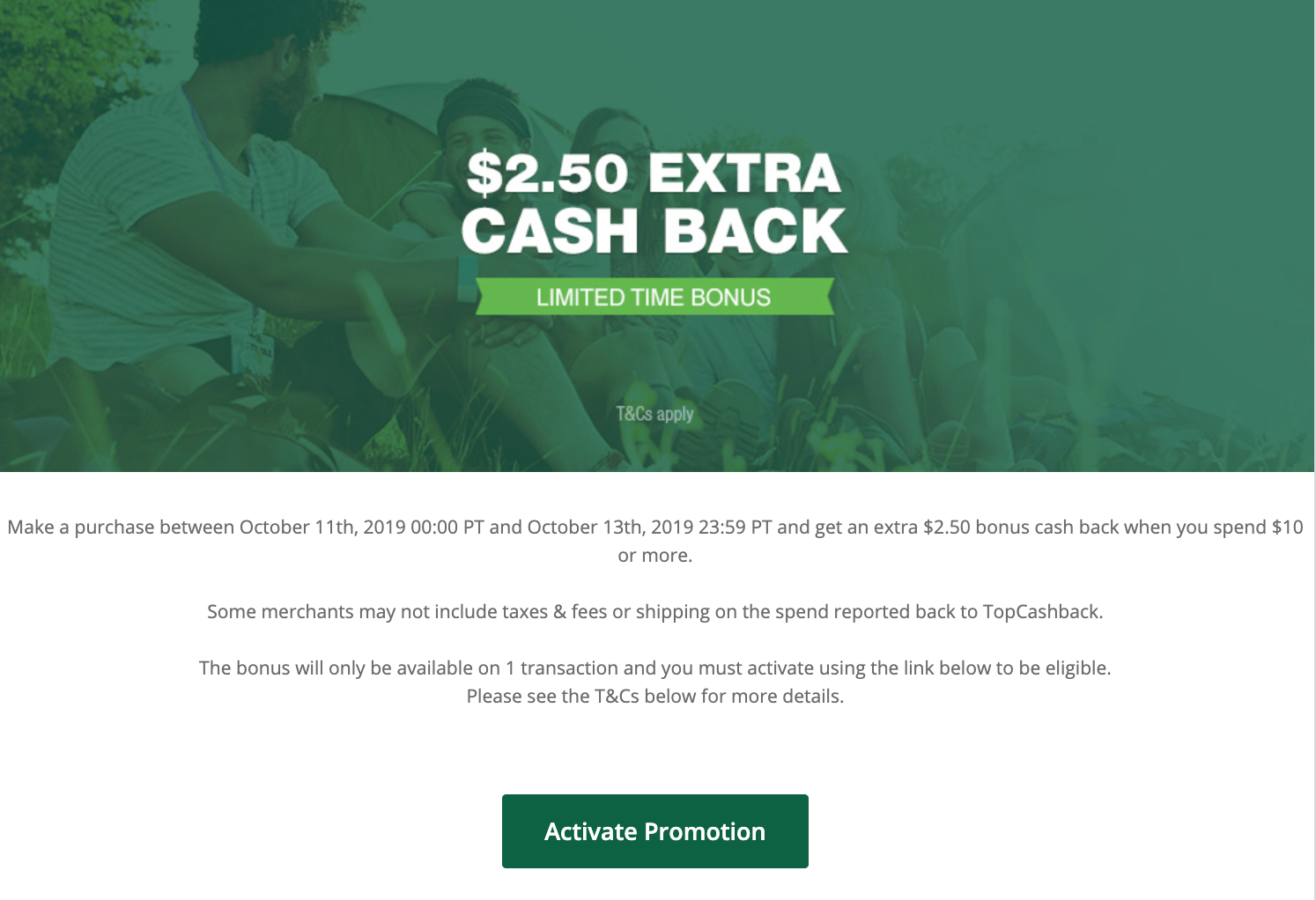 - You must make a purchase through TopCashback between October 11, 2019 00:00 PT and October 13, 2019 23:59 PT.