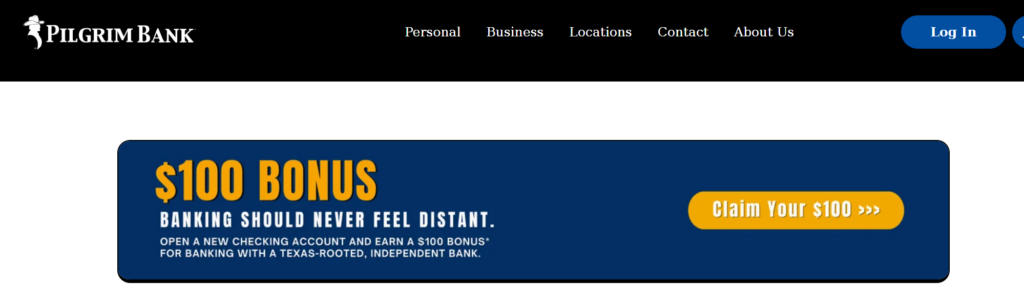 - Account is subject to approval. $100 bonus will be provided at account opening. Only new customers are eligible for the bonus. One bonus per household. To be eligible for the bonus, the individual opening the account must reside in Titus, Morris, Camp, Franklin, or Hopkins County, Texas. Account must be opened between 02/17/26 and 03/31/26. Pilgrim Bank employees are not eligible for the bonus.