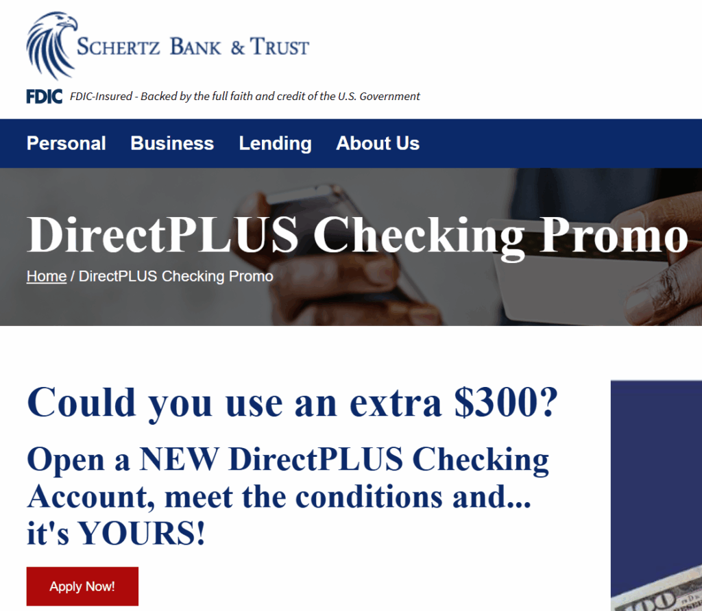 - Schertz Bank & Trust is offering a $300 bonus when you open a new checking a DirectPLUS Checking Account and complete the following requirements