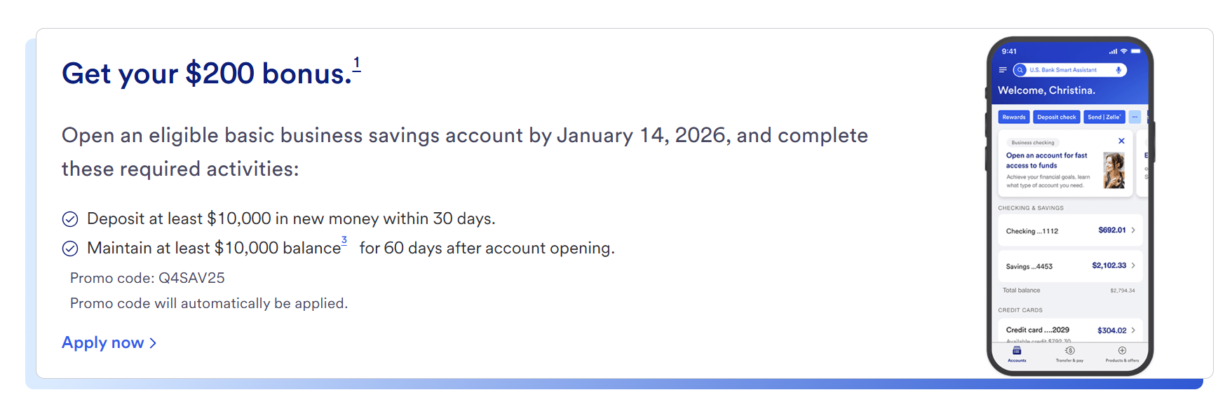 - Earn your $200 Business Savings bonus by opening a new U.S. Bank Basic Business Savings account between 10/01/2025 and 1/14/2026. You must make deposit(s) of at least $10,000 in new money within 30 days of account opening and thereafter maintain a daily balance of at least $10,000 until the 60th day after account opening. The interest rates and APYs for the U.S. Bank Basic Business Savings account are variable, determined at the bank’s discretion, and can change at any time.