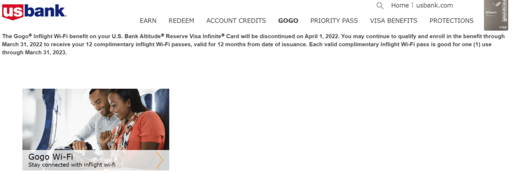 U.S. Bank Altitude Reserve will lose the Gogo Benefit on April 1, 2022. You can continue to enroll until March 31, 2022 and passes last for 12 months after they were issued.