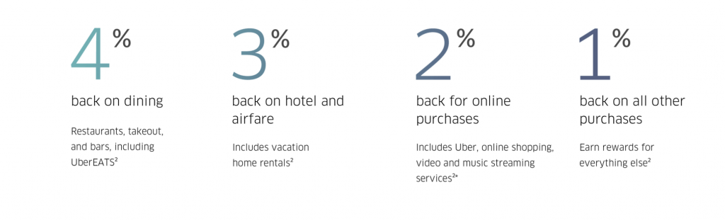 - 4% back on dining which includes restaurants, fast-food restaurants, takeout, and bars, including UberEATS