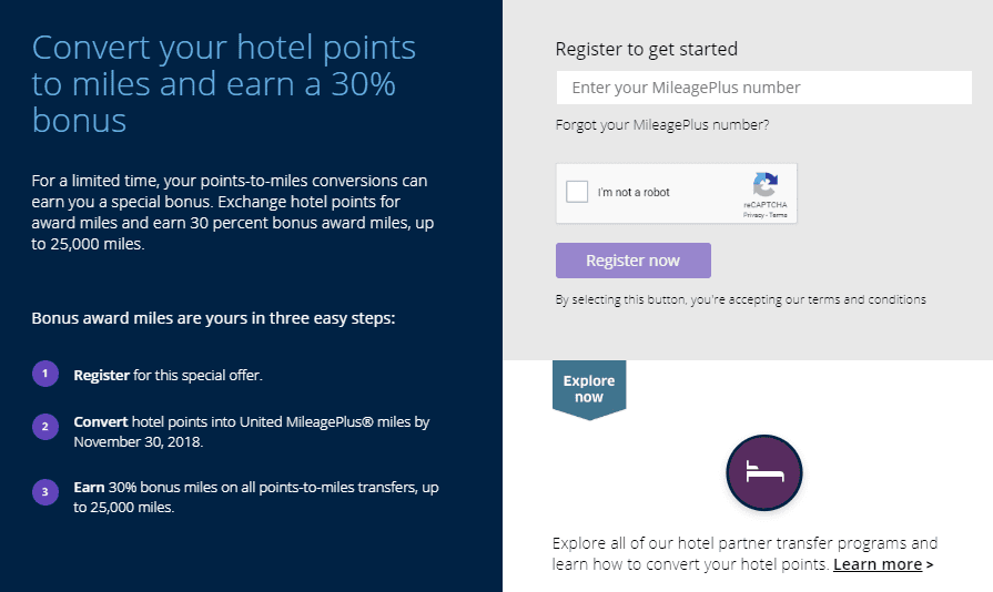 - United is offering a 30% bonus when you transfer hotel points, up to a maximum of 25,000 miles