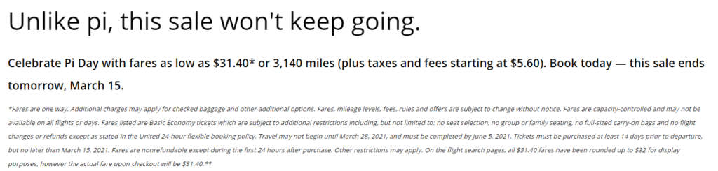 - United Airlines is offering a sale for Pi Day with flights starting from $31.40 or 3,140 miles.