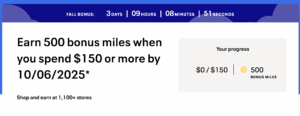 - *During the “Fall Bonus” offer, which runs from 9/29/2025 through 10/6/2025 at 11:59:59 pm ET (the “Bonus Period”), Member will earn a one-time bonus of 500 MileagePlus® bonus award miles on qualifying purchases made through the MileagePlus ShoppingSM mall or from purchases made through MileagePlus Shopping in-store offers. This one-time bonus award will be based on Member’s cumulative qualifying purchases made during the Bonus Period: 500 miles for qualifying purchases of $150 or more. “Qualifying purchases” do not include returns, cancellations, shipping and handling, taxes, gift card or other cash equivalent purchases, and certain products that are not eligible for bonus miles. Please see the MileagePlus Shopping mall site for details on product eligibility and other restrictions. Please allow up to 10 weeks after the Bonus Period for bonus award miles to post to your MileagePlus Shopping account. Void where prohibited by law. Offer subject to change or cancellation at any time.