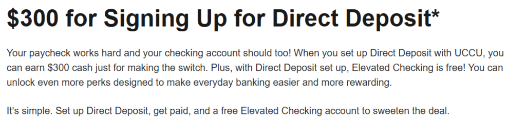 - UCCU is offering a $300 checking bonus when you open a new elevated checking account and complete the following requirements:
