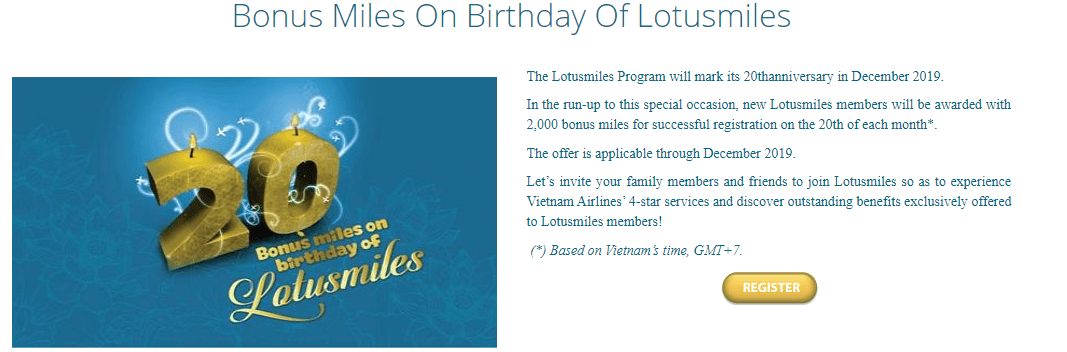 - Vietnam Airlines Lotusmiles program is offering 2,000 miles when you join the program, but you must sign up on the 20th of each month. Keep in mind this is based on Vietnam time (GMT+7)