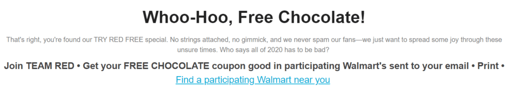 Walmart: Free RED Chocolate Bar September 22, 20209 Commentsby William Charles Contents1 The Offer2 Our Verdict The Offer Direct link to offer Get a free RED chocolate bar from Walmart Our Verdict Still need to pay sales tax. Looks like it’s a limit of one per purchase.
