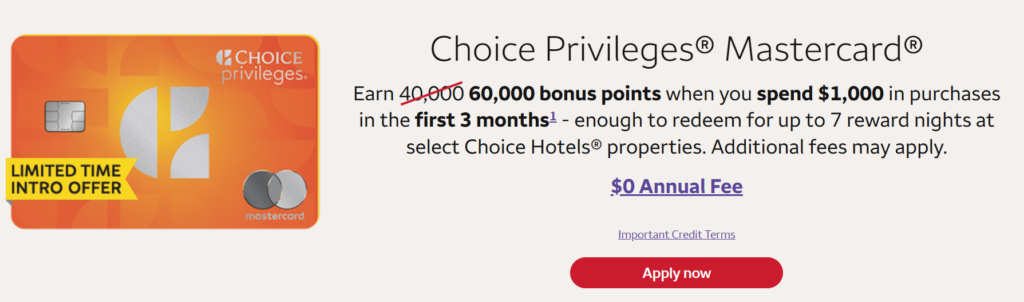 Previous high on this card has been 70,000 points, standard offer is 40,000 points. Free nights start at 6,000 points per night and go up to 35,000 points per night (properties in Australasia go up to 75,000 points. Now cost more than 35,000 in USA as well). With Choice it’s always a good idea to have a redemption in mind before applying. Still worth it for some people as some good value can be had, will add this to our list of the best credit card bonuses.