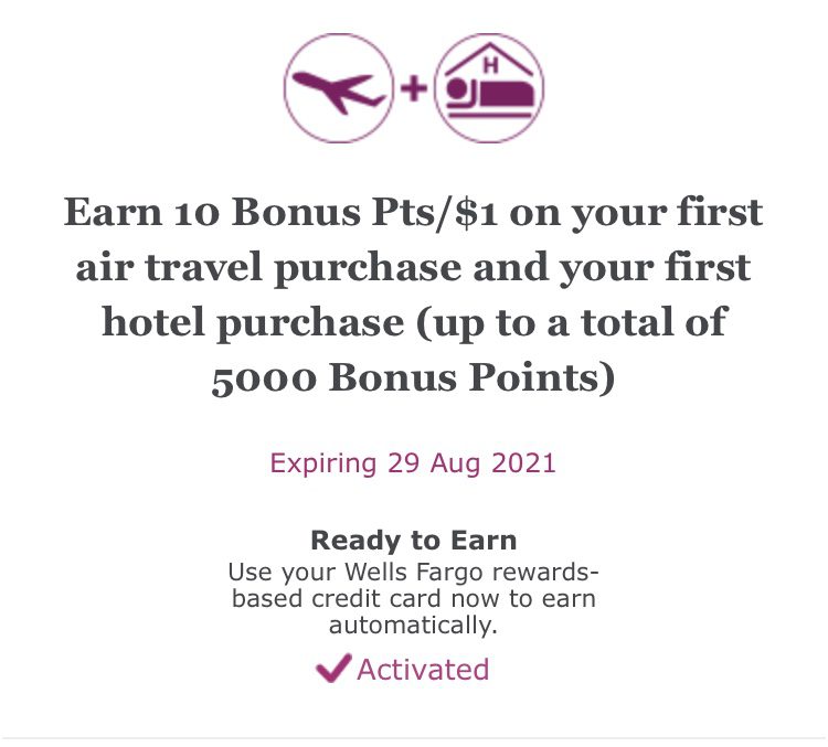 - Wells Fargo is offering the following deal. Earn 10% Bonus Cash Rewards on your first purchase on air travel/hotels (up to a total of $50 Bonus Cash Rewards)