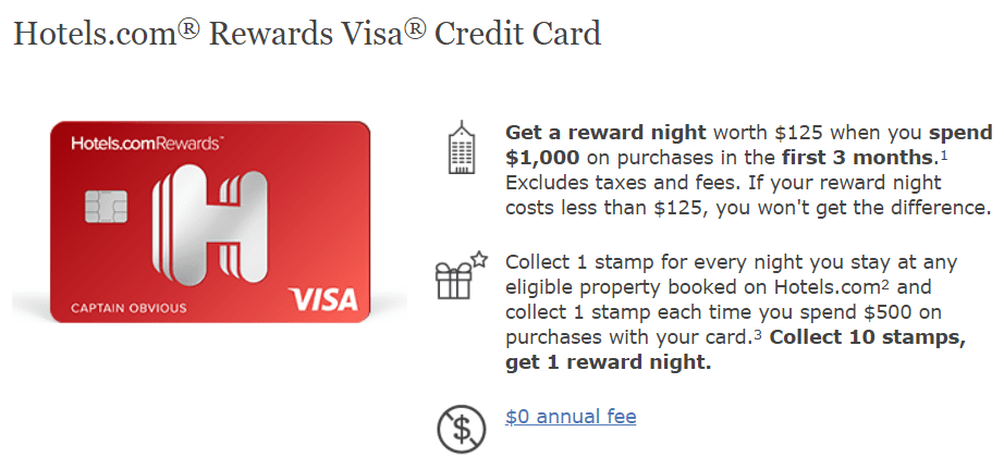 - Collect 1 stamp for every night you stay at any eligible property booked on Hotels.com and collect 1 stamp each time you spend $500 on purchases with your card. (10 stamps = 1 reward night). Stamps earned are valued $110 per night