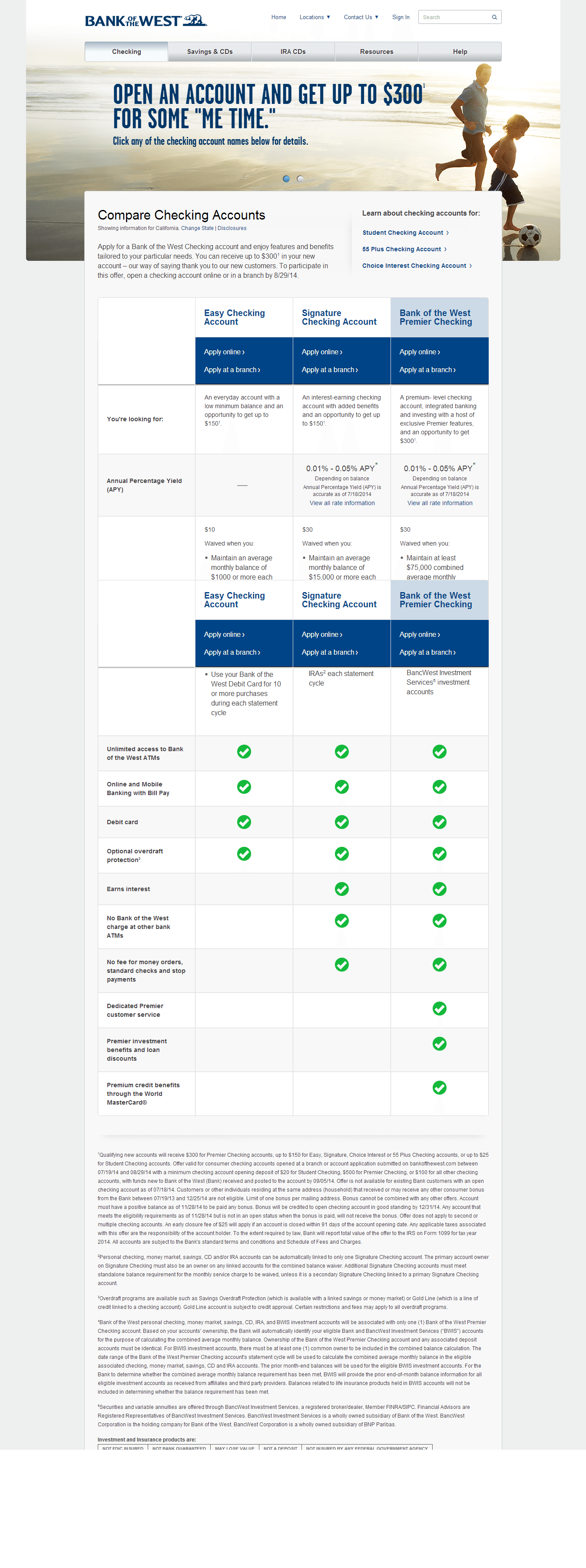 - Maintain at least $75,000 combined average monthly balance4 in this Bank of the West Premier Checking account plus other eligible personal Bank checking, money market, savings, CDs, and IRAs, and prior end-of-month account balances in eligible BancWest Investment Services5 investment accounts