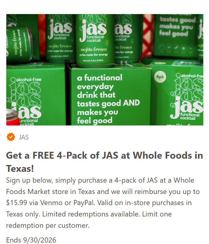 - Whole Foods in Texas is offering a free 4-Pack of JAS after rebate via WeStock