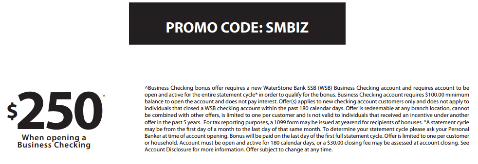 - WaterStone Bank is offering a $250 bonus when you open a new business checking account and complete the following requirements: