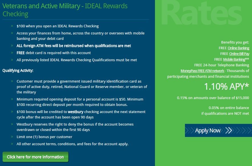 - Westbury Bank is offering a $100 bonus when you open an IDEAL Rewards Checking account. Bonus posts the next statement after it’s been 90 days from account opening. You must also receive a recurring direct deposit of at least $100.