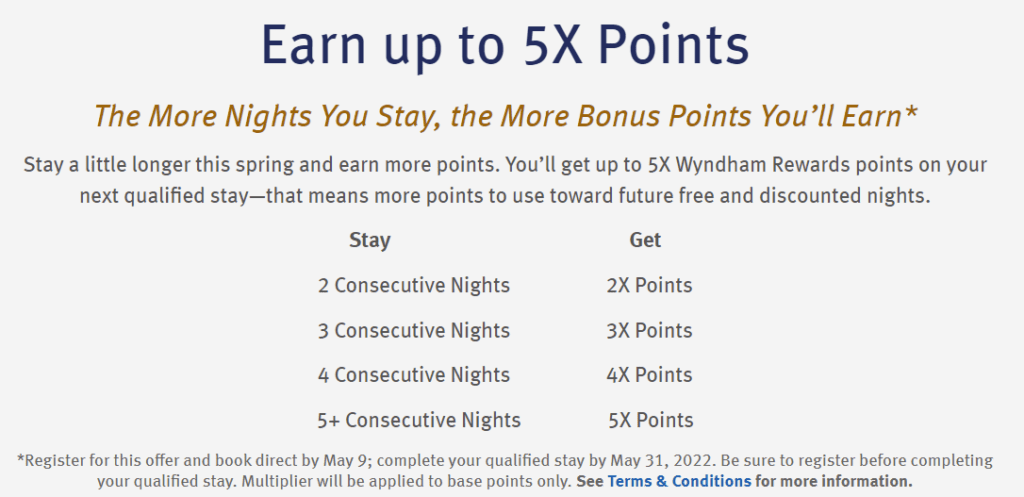 - Wyndham Rewards is offering up to 5x points on bookings. Must book by May 9 and stay by May 31, 2022. The amount of points you earn depends on your length of stay: