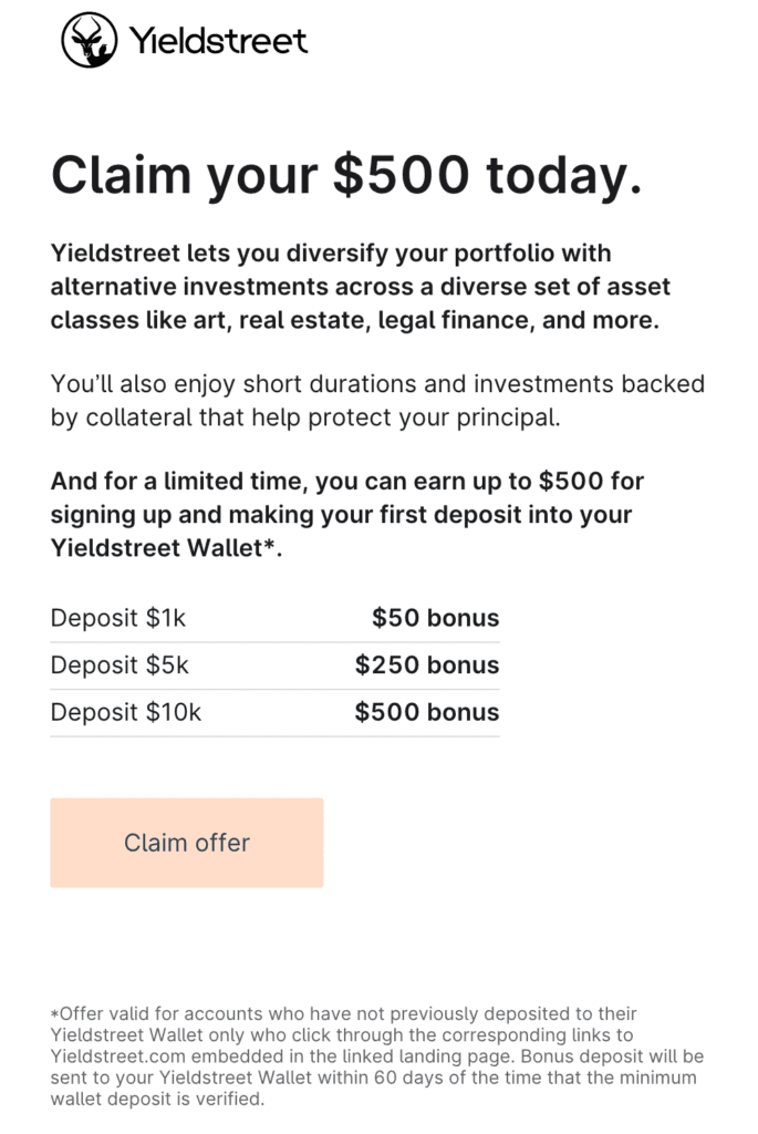 - YieldStreet investment platform offers a bonus when you sign up for an account and making your first deposit: