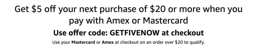 - Amazon is offering $5 off a purchase of $20+ when you pay with Mastercard or American Express and use promo code GETFIVENOW at checkout.