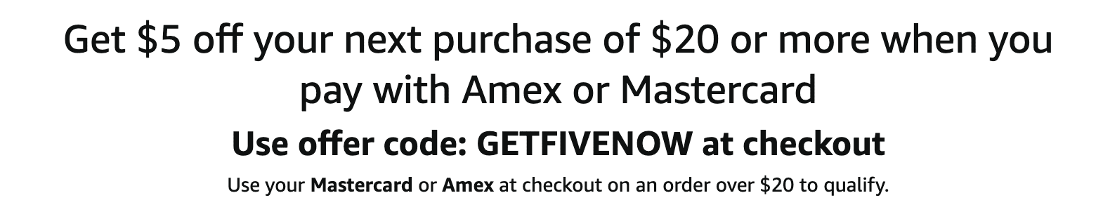 - Amazon is offering $5 off a purchase of $20+ when you pay with Mastercard or American Express and use promo code GETFIVENOW at checkout.