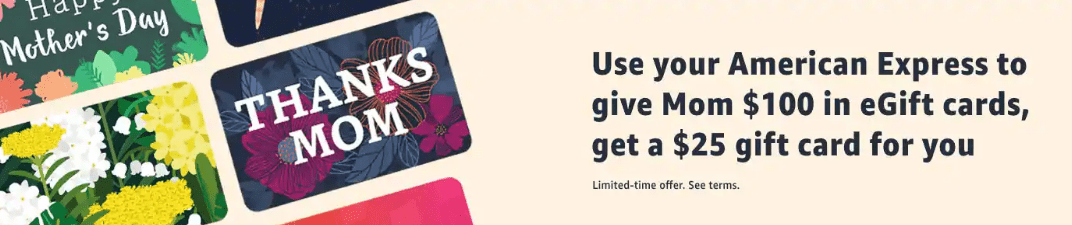 - Amazon is offering some customers a $25 bonus when they purchase $100 in eGift cards, use and American Express card and promo code AMEXMOM20
