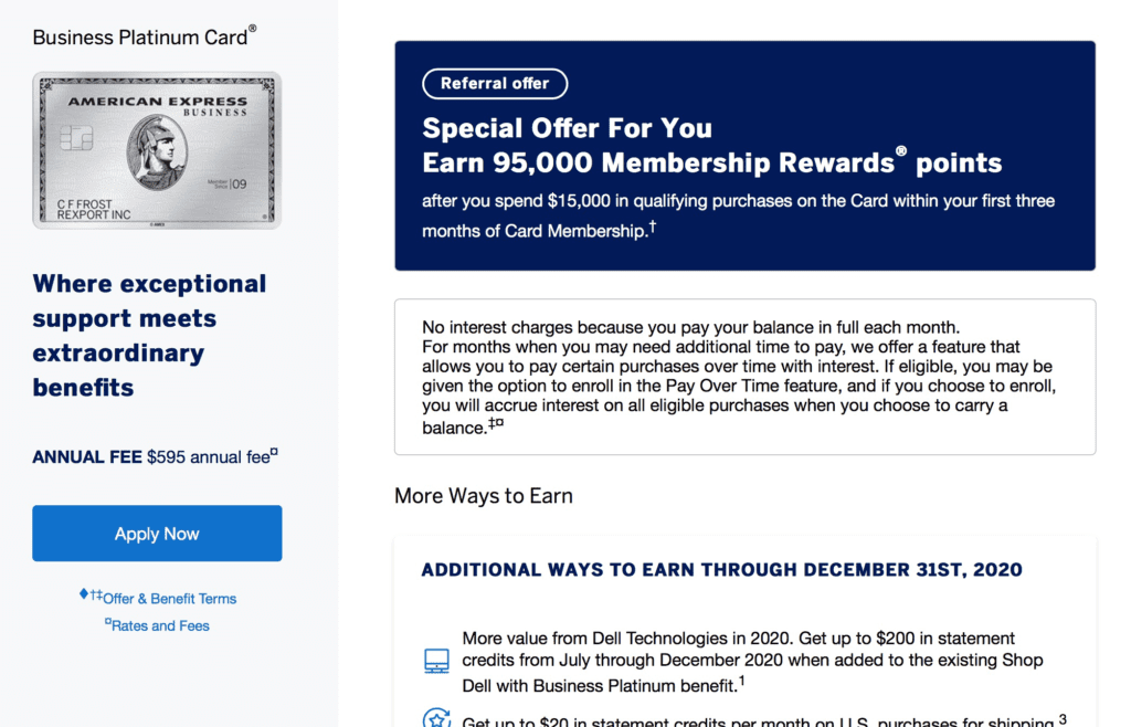 - American Express Business Platinum card also offers a $20 per month credit for both wireless and shipping purchases until December 31, 2020 as well.