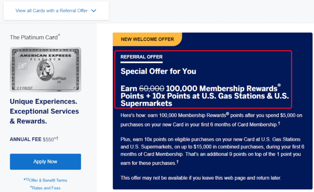 However, uscreditcards101 reports getting the 100,000 + 10x offer to show when using a referral link. I still can’t get it to show using any referral link, so it’s obviously not for everyone, but worth keeping an eye out. Might only work when using a Platinum card to refer to the Platinum card, and only on certain browsers or geographic locations.