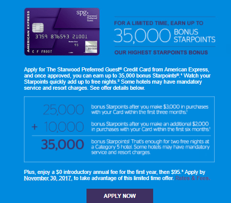 - American Express is offering a sign up bonus of up to 35,000 points on the SPG personal card. Bonus broken down as follows: