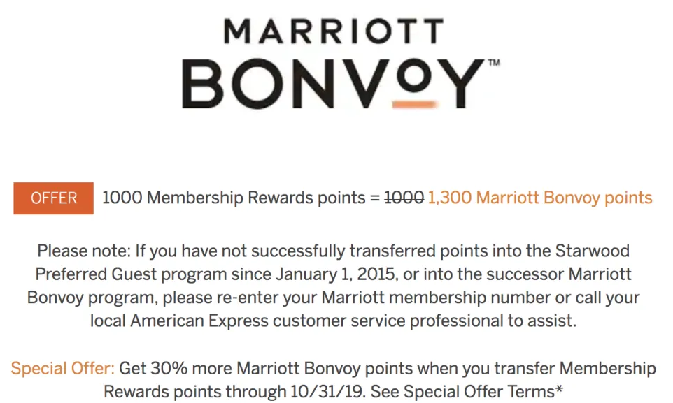 - Some American Express members are being targeted for a 30% transfer bonus to Marriott. Normally you can transfer 1,000 Membership Rewards points to 1,000 Marriott points. Under this promotion you’d receive 1,300 Marriott points.