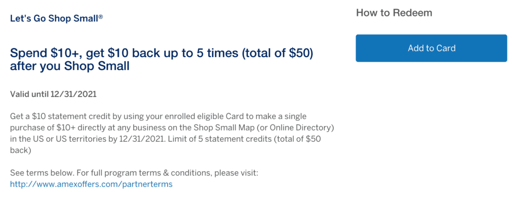 - QUALIFYING PURCHASES: A “qualifying purchase” means a purchase made at a business location on the Shop Small Map in the US or US territories available, at americanexpress.com/networkshopsmall, or the Online Directory, available at americanexpress.com/shopsmallonline, with your enrolled Card or with Pay with Points linked to an enrolled Card on or before 12/31/2021 in accordance with these terms.