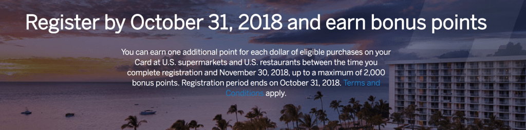 - You can earn one additional point for each dollar of eligible purchases on your Card at U.S. supermarkets and U.S. restaurants between the time you complete registration and November 30, 2018, up to a maximum of 2,000 bonus points.