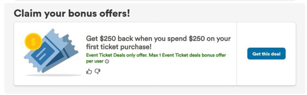 - Capital One shopping is offering $250 back when you spend $250+ on your first ticket purchase